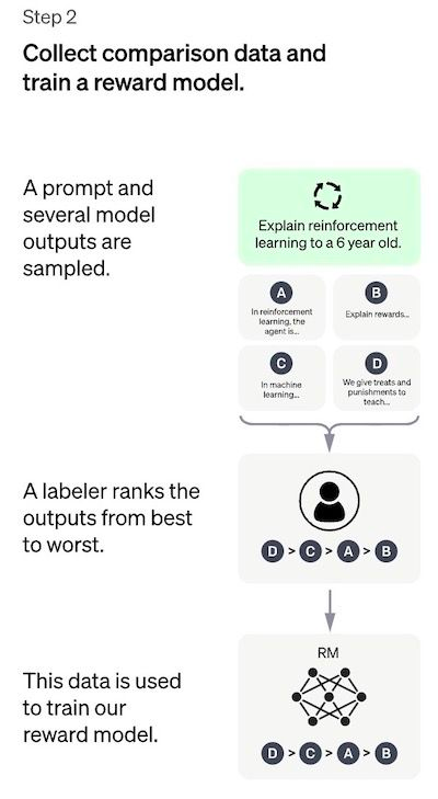 此新數據用于訓練 RM 模型 。該模型將 SFT 模型輸出作為輸入,并按優(yōu)先順序對它們進行排序。