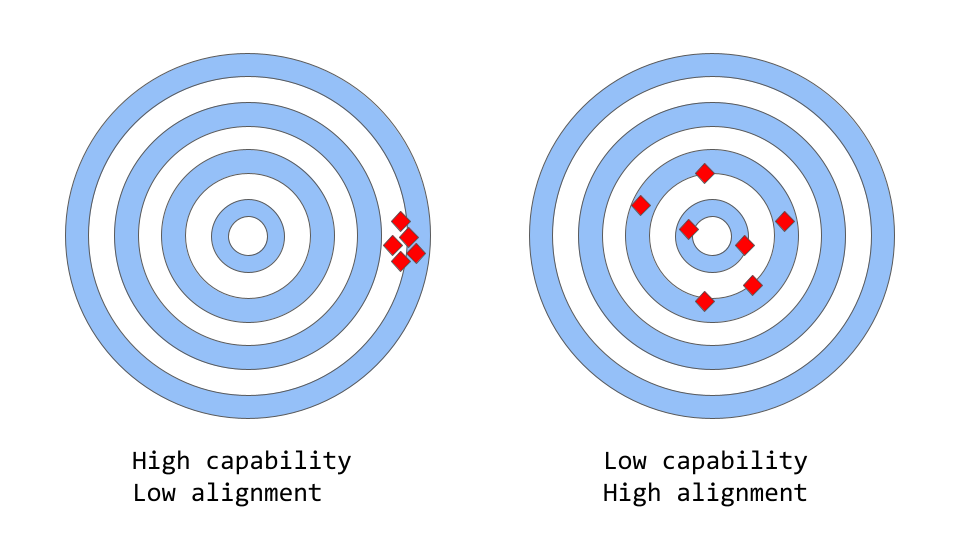 「一致性 vs 能力」可以被認為是「準確性 vs 精確性」的更抽象的類比。